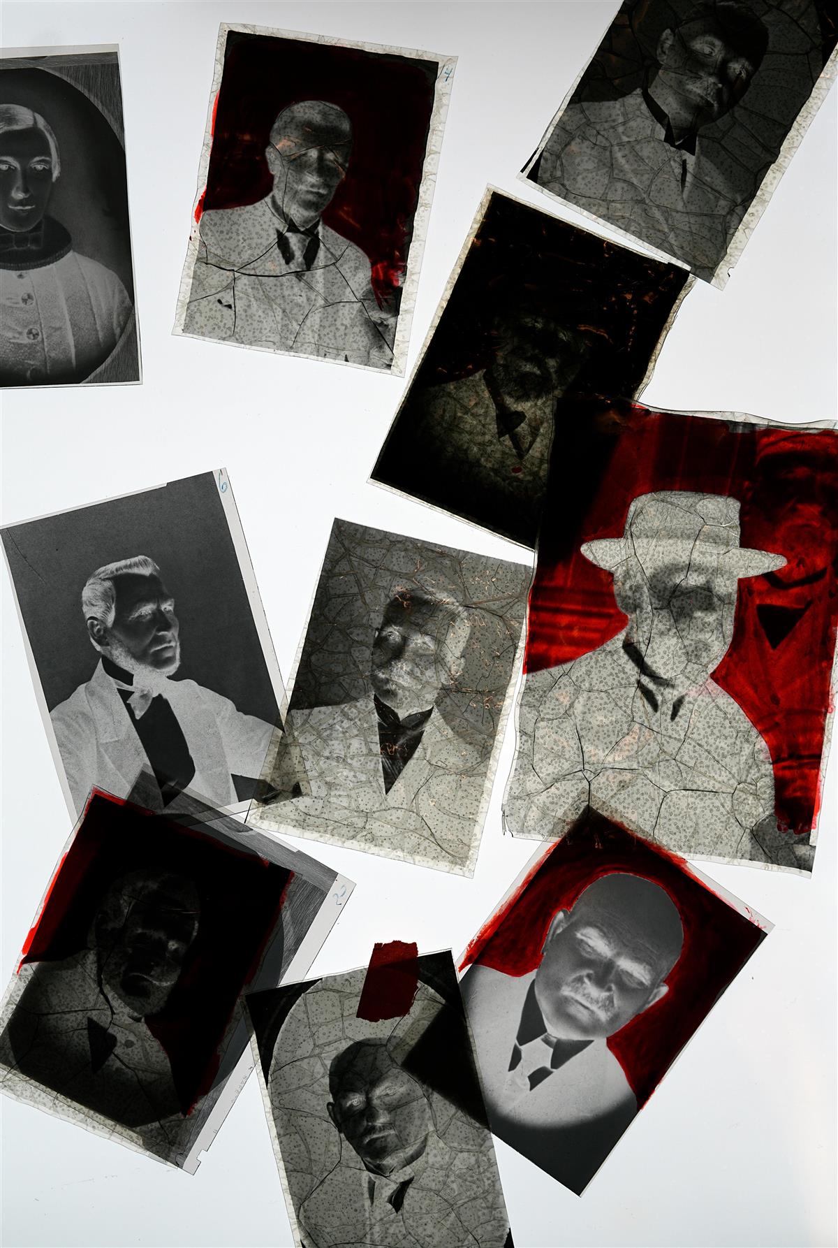Negativer er noe det finnes mye av i arkivene våre. For å se hvordan bildene "egentlig" skal se ut, må de framkalles. Her kan vi se hvordan nedbryting av acetatfilmen har gjort at det har oppstått bobler og spindelvevmønster på negativene.